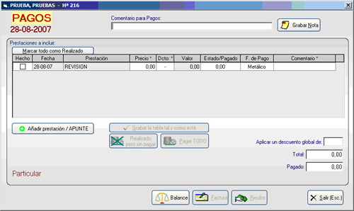 Desde la pantalla de Pagos el programa nos permite, aparte de recoger el pago del paciente, emitir factura, recibos o bien justificantes personalizados de pago. Así como la revisión del balance de situación del paciente.