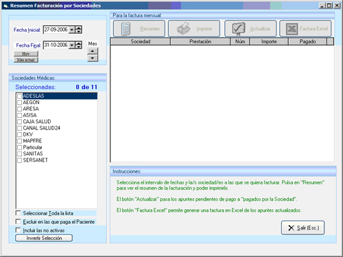 También nos permite el programa realizar listados de facturas emitidas tanto a particulares como a sociedades, agrupándolos por periodos de tiempo y permitiéndonos imprimir el resultado o exportarlo a Microsoft Excel.