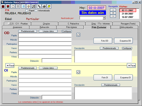 La pantalla del historial clínico está dividida por apartados permitiendo así acceder de forma sencilla e intuitiva a cada opción. También tenemos la posibilidad de definir por cada ordenador el apartado que queremos que aparezca cuando se abra la pantalla de historial clĂnico permitiendo así mayor agilidad en la gestión.